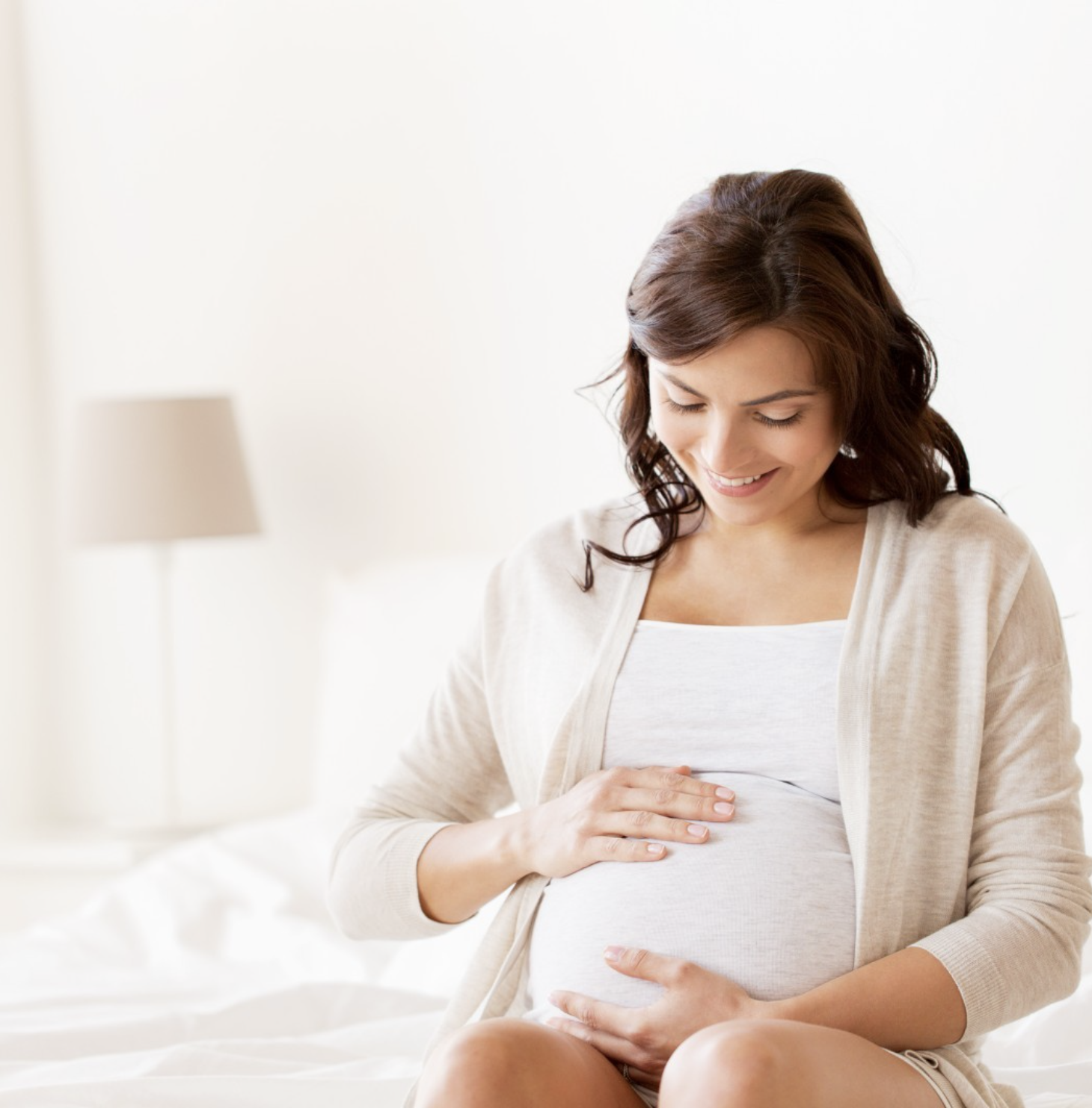 A calm, intimate moment of a mother-to-be gently holding her baby bump, reflecting the importance of nourishing both herself and her growing baby during pregnancy.